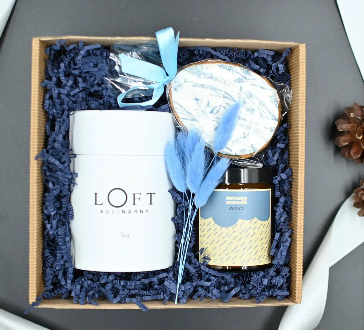 Aromatyczna herbata Earl Grey, świeca sojowa i ręcznie dekorowany piernik w eleganckim zestawie prezentowym.