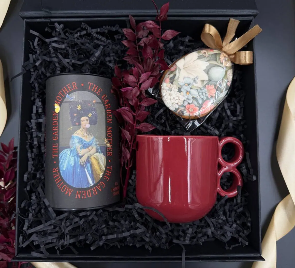 Aromatyczna czarna herbata, burgundowy kubek i ręcznie dekorowany piernik w eleganckim zestawie.